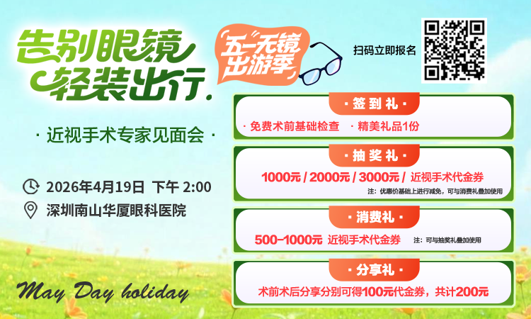 4月19日下午2点,深圳南山华厦眼科医院将举办告别眼镜 轻装出行-近视手术专家见面会。有需要的朋友可以扫码报名!